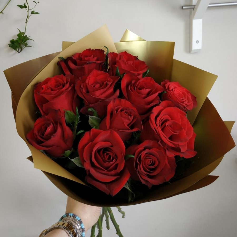 На фото букет из 11 бордовых роз. В составе: роза 11 шт, дизайнерская упаковка 1 шт, атласная лента 1 шт, . Все цветы свежие и ароматные, букет красиво оформлен и отлично подходит для подарка. Доступна доставка цветов или самовывоз.