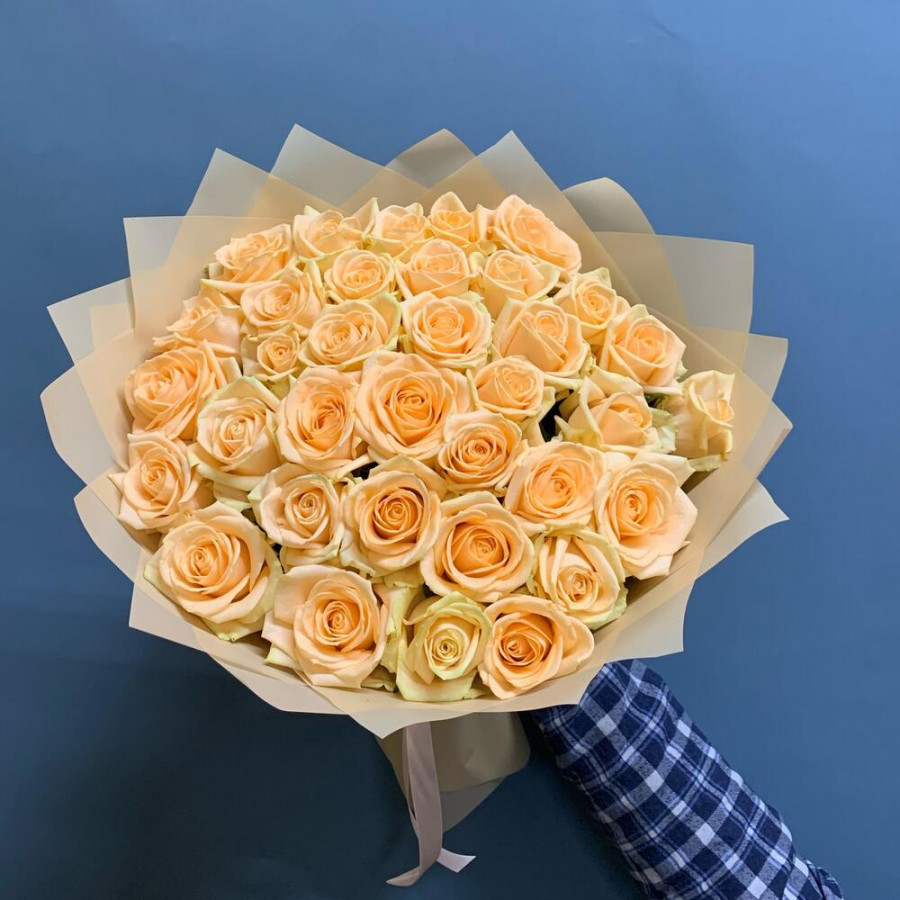 На фото букет из 35 кремовых роз. В составе: роза 35 шт, дизайнерская упаковка 2 шт, атласная лента 1 шт, . Все цветы свежие и ароматные, букет красиво оформлен и отлично подходит для подарка. Доступна доставка цветов или самовывоз.